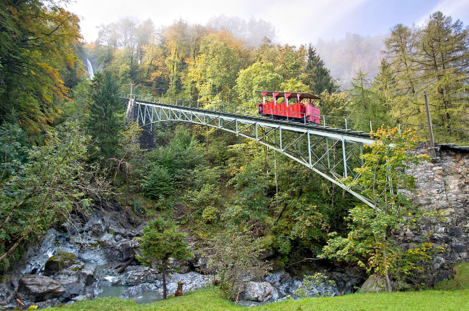 In Meiringen, a historic funicular railway takes you up to the legendary Reichenbach Falls, the scene where Sherlock Holmes and his arch-enemy Professor Moriarty both plunge to their deaths in a fight in Conan Doyle's story "The Final Problem".